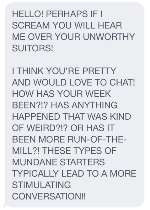 If you wouldn’t shout this over her “unworthy suitors” in a bar, then stick to lower case. Also, if you’re calling your own opener mundane, that’s a clear sign you need to up your Tinder game.