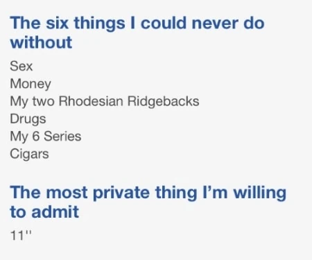 This prompt is your opportunity to stand out. Most guys usually write something boring like “I have this profile”. This guy went a bit too far against the grain.